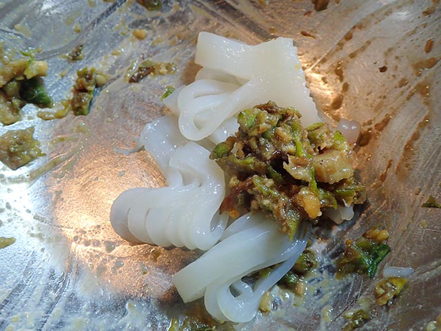 イカ刺も同様にフキ味噌で和えます。こちらには醤油は加えません。