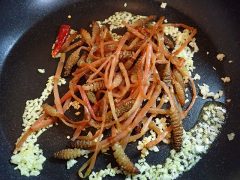 香りが出たら、下茹でしたつくし50gを入れて、塩とブラックペッパー各少々振って軽く炒めます。